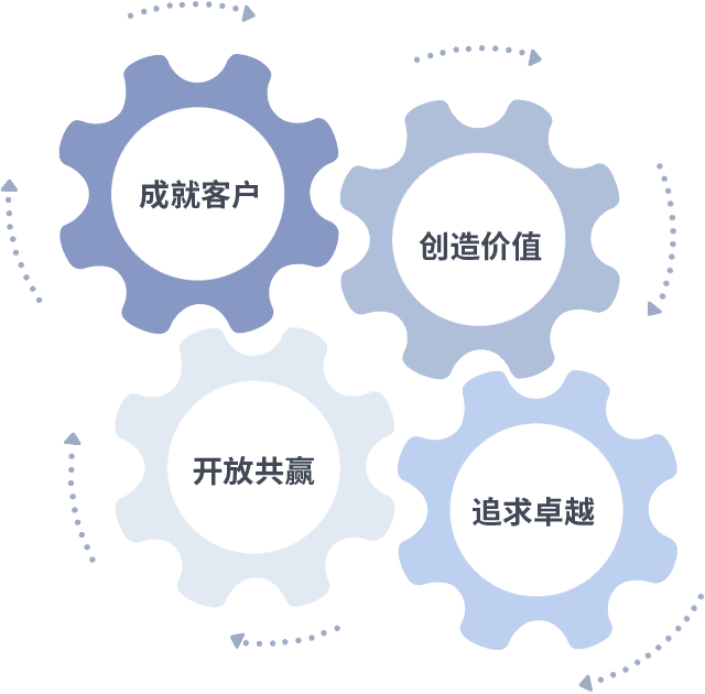成就客户是一切决策的出发点,,创造价值是衡量所有工作的标准,,追求卓越是我们做事做人的态度,,,,开放共赢是我们的格局也是最终的结果。。价值观的齿轮环环相扣,,,推动着组织里的每个人不断向前。。。。